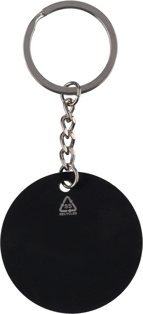 Recycled stainless steel rubberized keychain with metal ring in a round soccer ball design. Features an engraved recycled logo that reveals a shiny mirror effect after engraving. Individually packed in a kraft paper envelope.