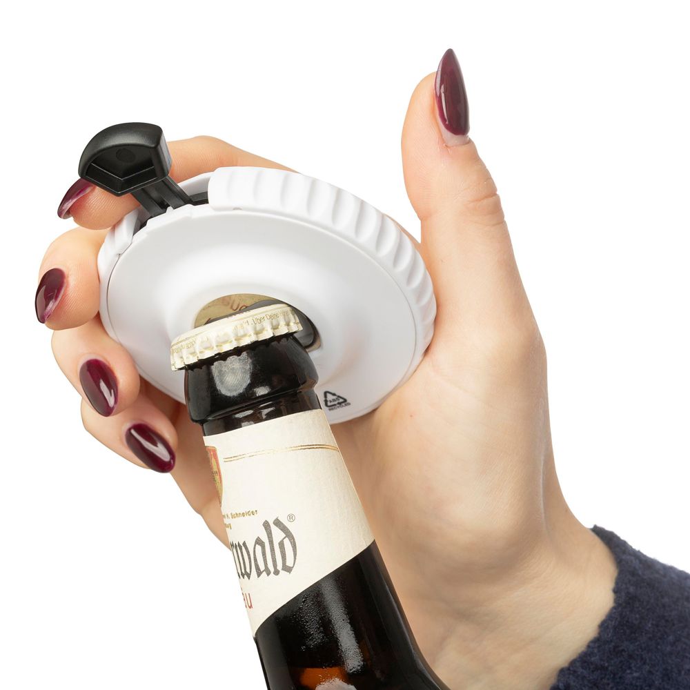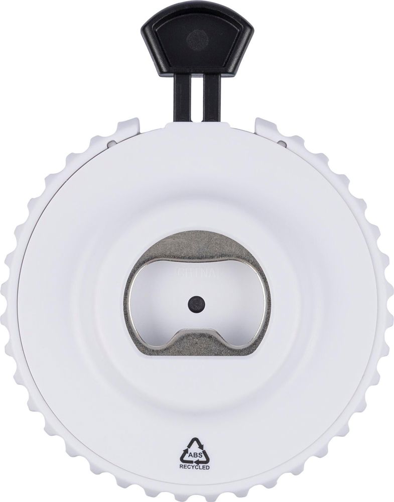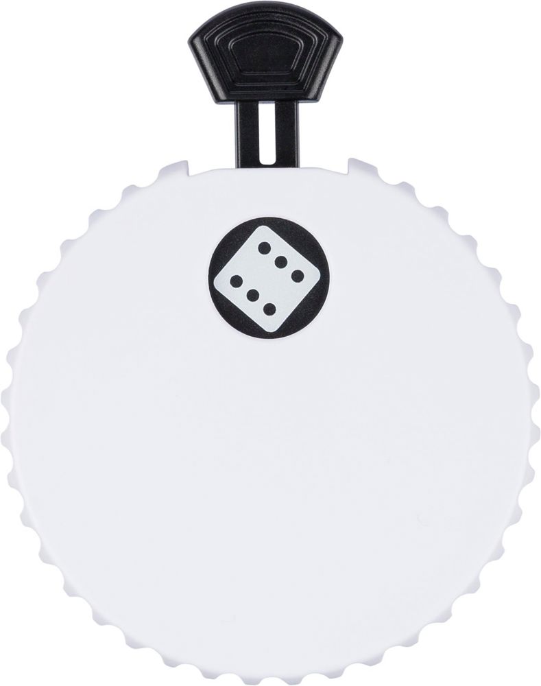Recycled ABS mechanical dice with push button on the top. Press to spin the internal mechanism and reveal a random number from 1 to 6. Includes a bottle opener on the back and a small Recycled ABS logo. Packed in a recycled polybag.