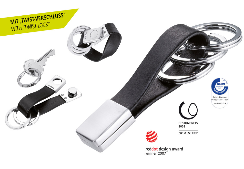 Keyring with angular "twist" fastener, leather loop, 3 keyrings, leather/metal, black