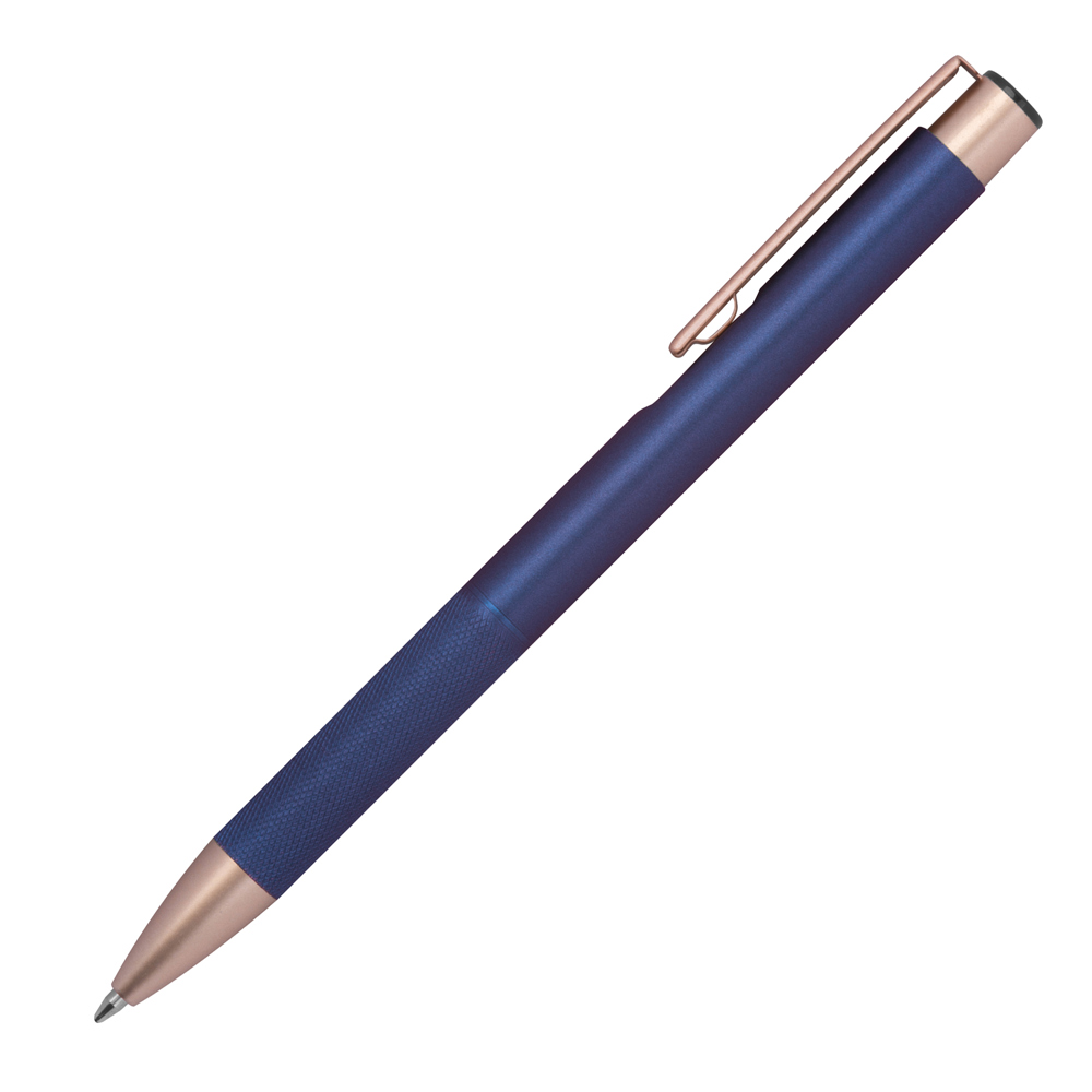 Unser Kugelschreiber aus recyceltem Aluminium überzeugt durch seine elegante Optik mit rosé goldenen Applikationen und einer Griffzone in edler Diamantoptik. Die blau schreibende Großraummine sorgt für ein angenehmes Schreibgefühl – ideal für den täglichen Einsatz im Büro, unterwegs oder als hochwertiges Werbegeschenk. Ein Statement für Nachhaltigkeit und Stil.