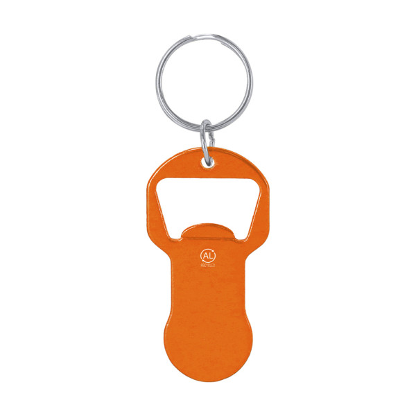 Recycled Aluminum coin opener keychain with shiny metallic finish. On the top function bottle...