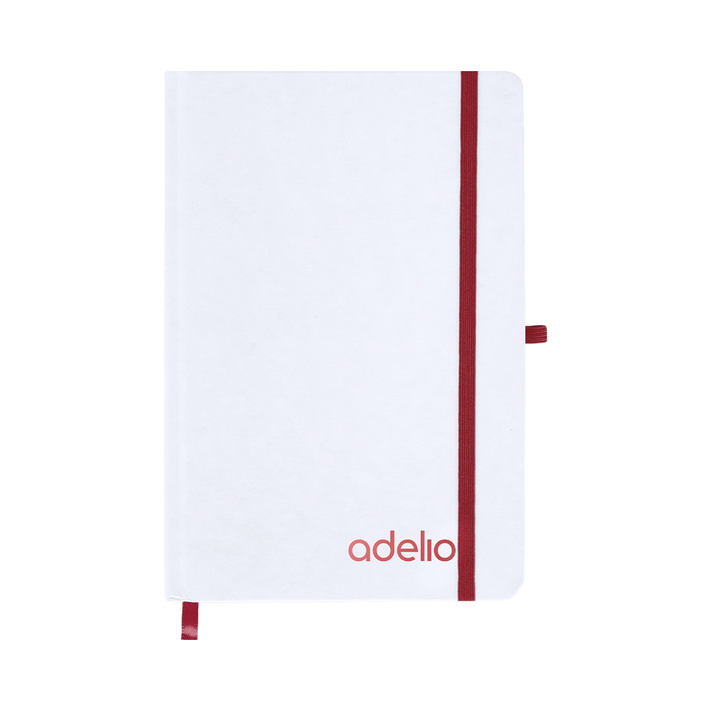Notepad with rigid white covers made of Recycled Cardboard. Interior with 80 sheets available for a stripe. Includes bookmark, in the same color as elastic closure tape and pen holder. Special for laser engraving showing the selected color.