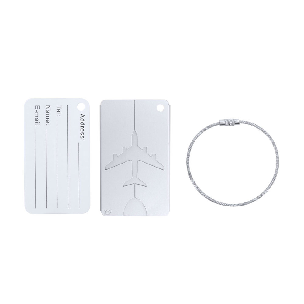 Original suitcase identifier with airplane design in resistant Recycled Aluminum. With stainless steel coupling tape with screw closure system and identification card in English with the following printed fields; Addres, Tel, Name, E-mail. AL Recycled logo laser engraved.