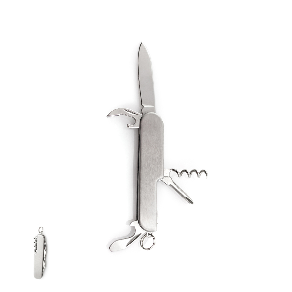 Multi purpose stainless steel knife with 6 functions. Includes knife, openers, screwdriver and keychain. Presented in an individual box.