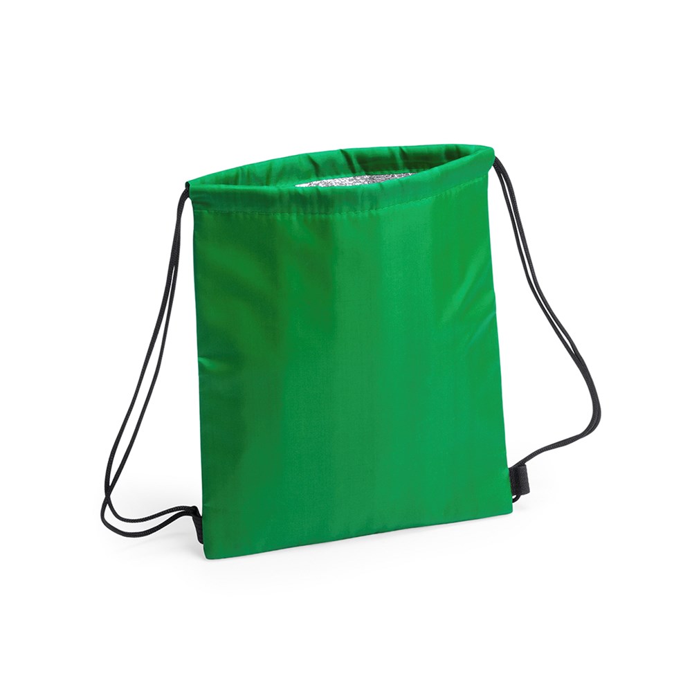 Drawstring cooler backpack for children in soft polyester 210D, with cheerful colors and in a wide range of tones. With black self closing ropes and reinforced corners. Isothermal inside in aluminum finish.