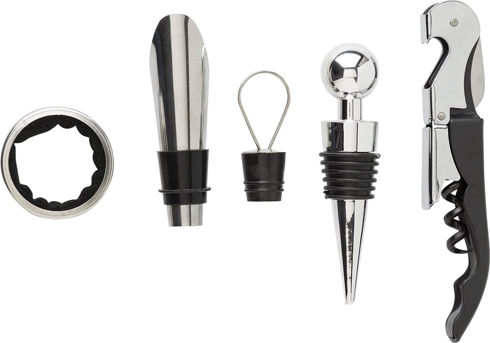 PU with cork look wineset with 4 accessories (s/s304). Including waiters knife, bottle stop, drip catcher, and pouring sprout. Individually packaged in a brown cardboard box.