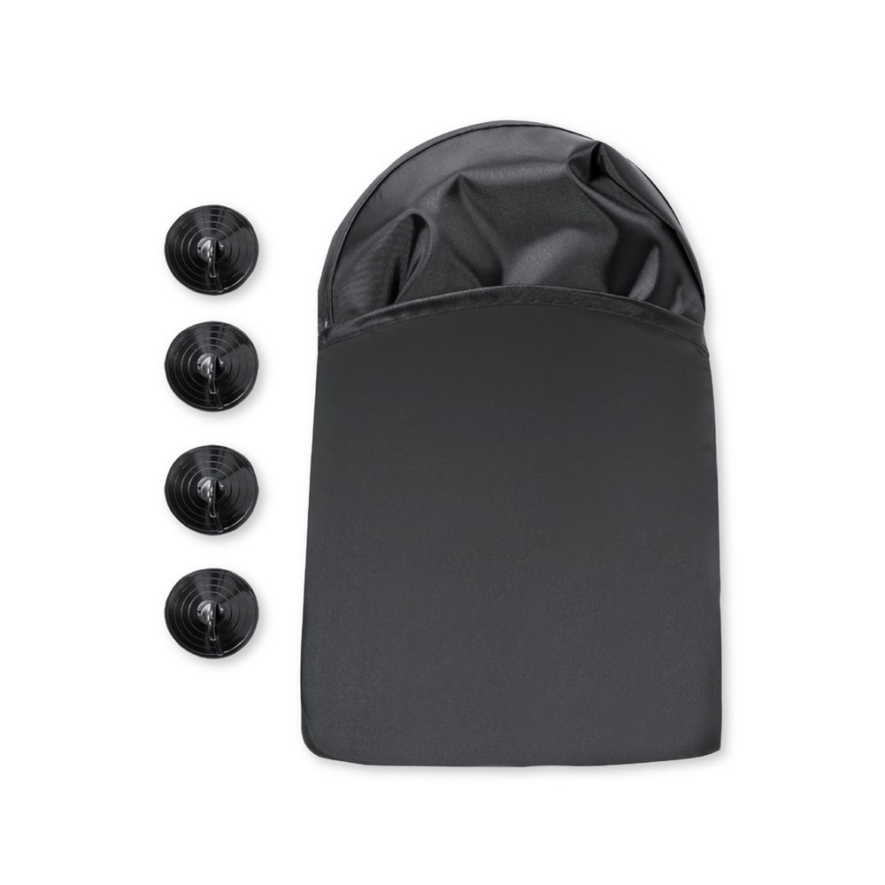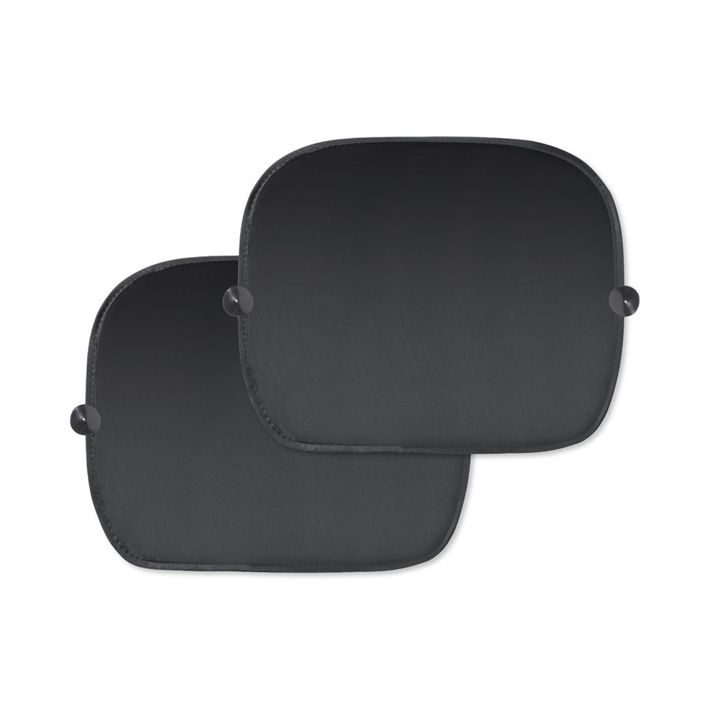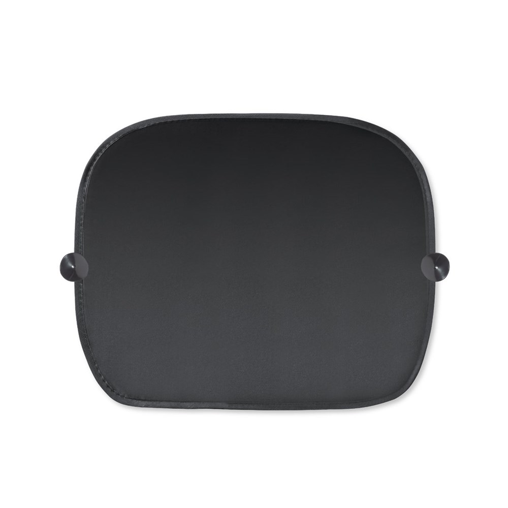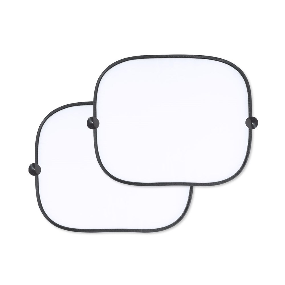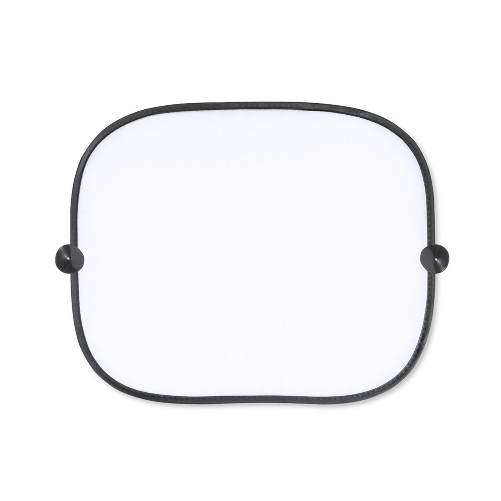 A set of 2 foldable sunshades for car windows, made from durable polyester. Lightweight and measuring 44 x 36 cm each, with reinforced edges and attachment via suction cups (4 units included). Comes with a simple folding system and an individual matching cover. Special white color for sublimation.