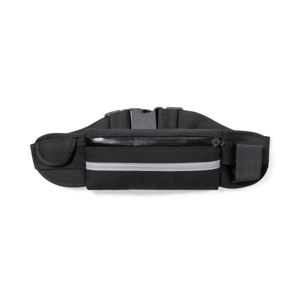 High quality waistbag made of durable soft shell (neoprene), with reflective band. Main compartment with zip closure, elastic bottle holder and pocket for keys and other small items. With buckle closure and adjustable strap, specially designed for sports and leisure activities.