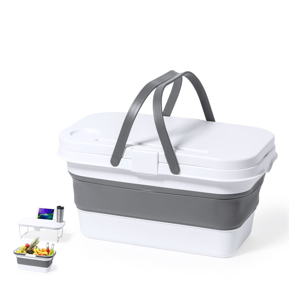 Foldable, multifunctional picnic cooler basket. Made of resistant PP material in white finish, with a capacity of 16 litres. Lid convertible into a table by means of 2 folding legs, with built-in holders for smartphone/tablet and bottle. Including 2 folding carry handles in grey. Small size when folded, ideal for an easy storage.