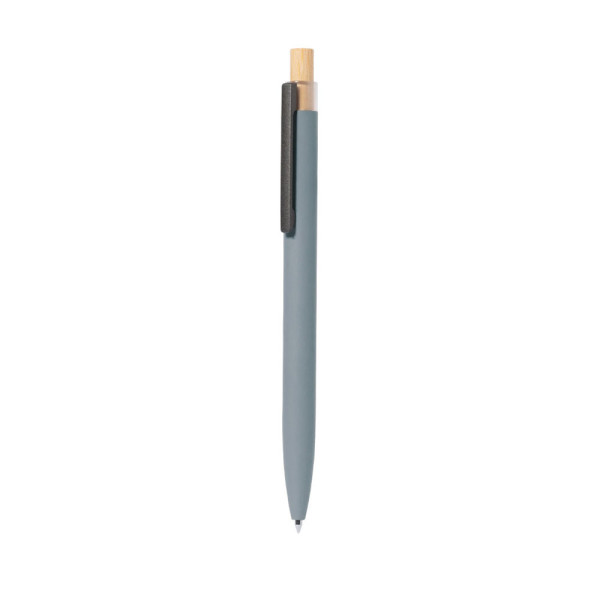 Push-button mechanism ball pen made of recycled aluminium. Bamboo push button and rubber grip, available in a wide range of stylish colours. Metallic clip and distinctive recycled aluminium on the top of the pen. Jumbo cartridge in blue ink. Presented in an individual recycled pouch.Recycled aluminium is a material with almost infinite recycling possibilities, without losing its original properties and consuming less energy in the process.GRS (Global Recycled Standard) certification, guaranteeing the recycled origin of the material used to manufacture the product.