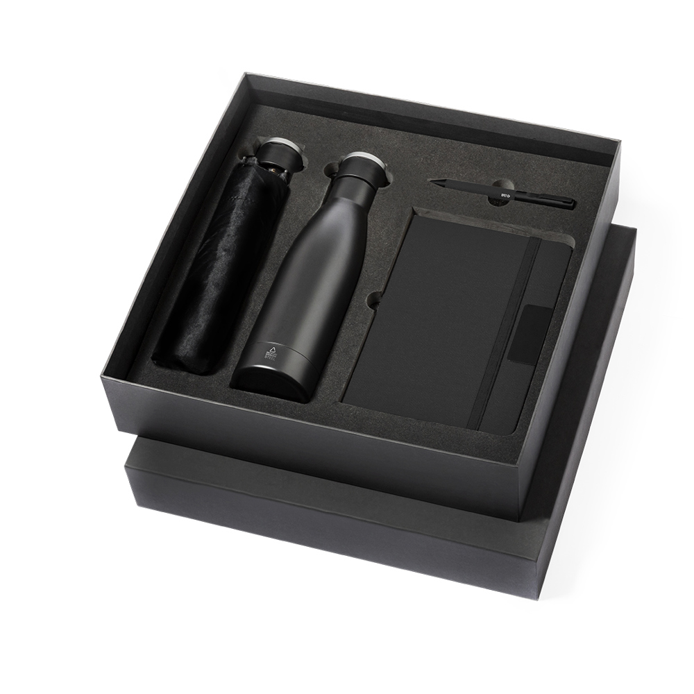 Stylish premium set including:Recycled stainless steel double-layer thermos bottle with matte black finish and 500ml capacity. Matte silver metal handle, With stainless steel badge.RPET notepad in elegant black, with special metal detail for laser branding. Including elastic bands and fabric bookmark. Inside with 80 sheets, single-stripe layout. With RPET logo.98 cm diameter folding umbrella in black color. Made in 190T RPET pongee material. Manual opening, with windproof mechanism and fiberglass ribs. With carrying sleeve and matching straps. With distinctive RPET label.RPET ball pen with matt black finish, twist mechanism and blue ink. The RPET material is made from recycled plastic to encourage the reuse of plastic waste and help the sustainability of the planet.Set presented in an individual matte-finish, case with inside die cut for each of the elements of the set.