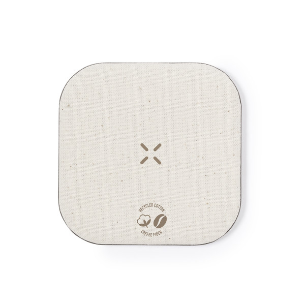 Wireless charger made of coffee fibre and recycled cotton. Non-slip base and compatible with devices equipped with Qi charging technology. Charging capacity of 15W, with Type C cable included in black color. Coffee fibre and recycled cotton logo. Presented in an attractive kraft design box, with instruction manual in English and Spanish.Coffee fibre is a circular solution that is obtained from the use of the waste produced in the production of coffee. A sustainable alternative that favours the reduction of the use of plastics, saving energy in its manufacturing process and contributing to the care of the environment. GRS (Global Recycled Standard) certification is available, which guarantees the recycled origin of the material used to manufacture the product.