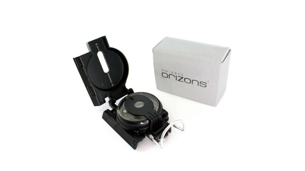 High precision Orizons compass in resistant aluminum, with fixing accessory and presented in an attractive design box with the brand logo.