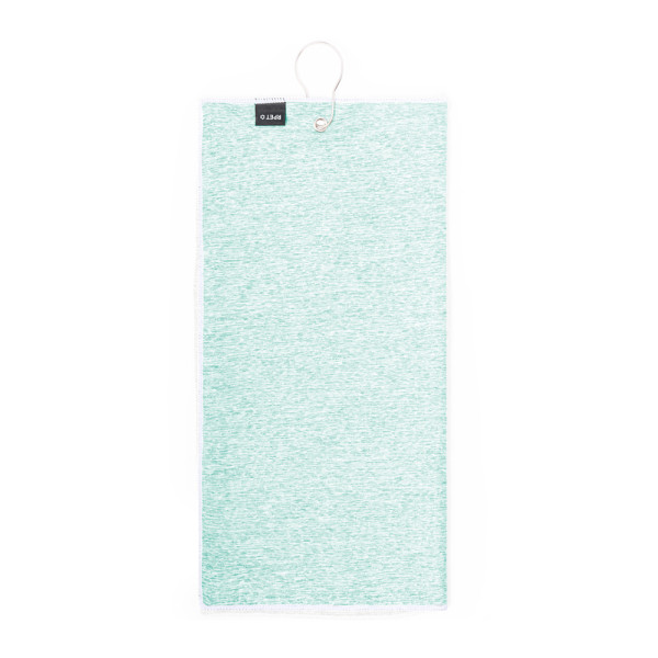 Golf towel made of RPET, absorbent and soft with dimensions of 40x60 cm. In the centre, it includes a reinforced ring and a carabiner, both made in stainless steel. With RPET label.RPET material is made from recycled plastic, thus promoting the reuse of plastic waste and helping the sustainability of the planet.