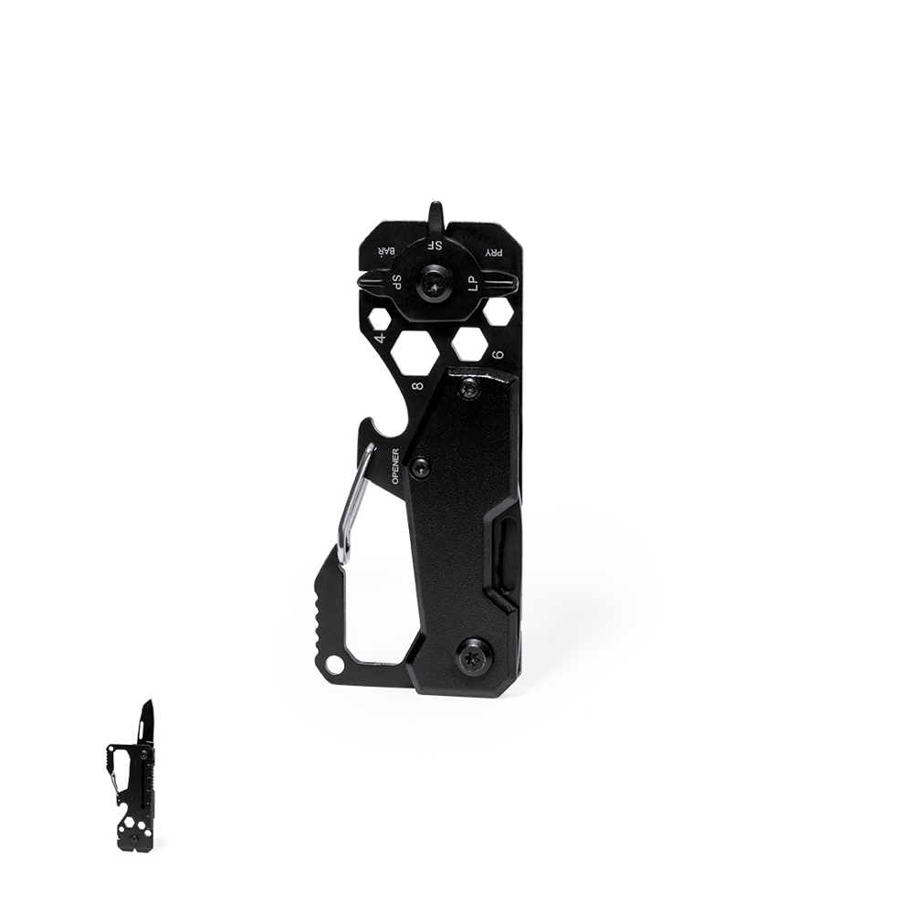 Superb multi-tool made of Aluminium and stainless steel with black finish. With 13 different functions: spanner for hex nuts in various sizes, carabiner, can opener, ruler, scraper, knife, flat and phillips screwdrivers. Presented in a kraft design box.