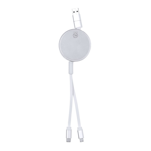 Extendable charger and synchroniser cable, suitable for data transfer and made of recycled aluminium with metallic finish. Central housing with large branding surface, specially designed for laser engraving. Available in a wide range of colours, with matching cables. Type C and USB input connections, with Lightning, Micro USB and Type C outputs. 5V DC 2.4A. Packed in an individual kraft design bag.Recycled Aluminium is a material with almost infinite recycling possibilities, keeping its original properties and consuming less energy during this process.GRS Certification (Global Recycled Standard), which guarantees the recycled origin of the material used to manufacture the product.