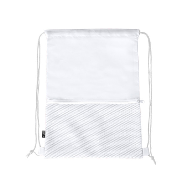 Drawstring backpack made of soft 210D RPET polyester. Self-closing strings in black color and a front mesh pocket with matching zip closure. RPET side label and available in a variety of colours (white color specially made for sublimation printing).