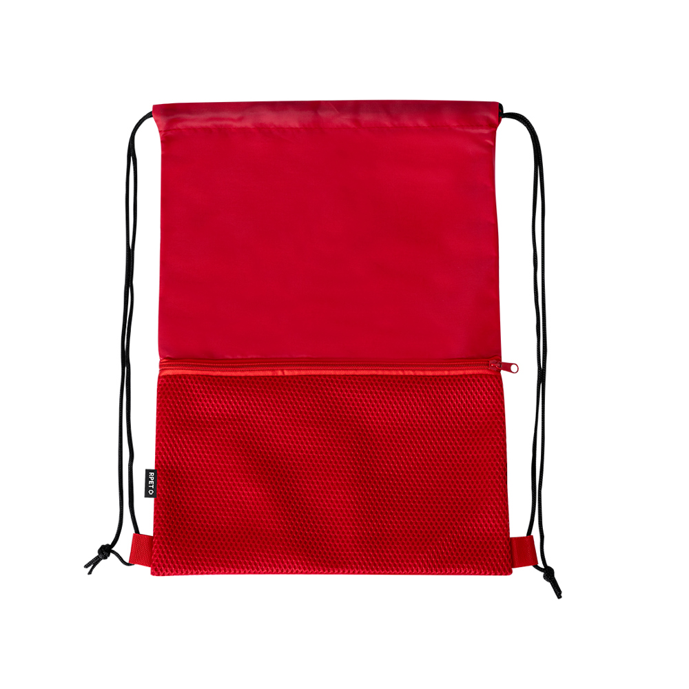 Drawstring backpack made of soft 210D RPET polyester. Self-closing strings in black color and a front mesh pocket with matching zip closure. RPET side label and available in a variety of colours (white color specially made for sublimation printing).