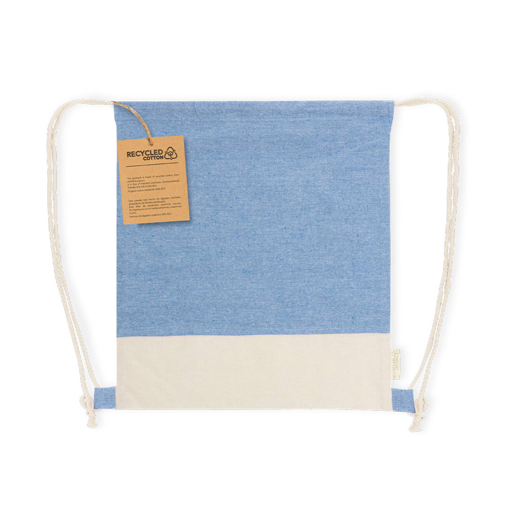 Drawstring backpack made of recycled cotton material 120 g/m2. The self-closing strings are also made of cotton and The base is in a natural colour to match the strings. Eco logo visible on the side label and available in a wide range of nature colours. Resistance up to 6kg in weight.