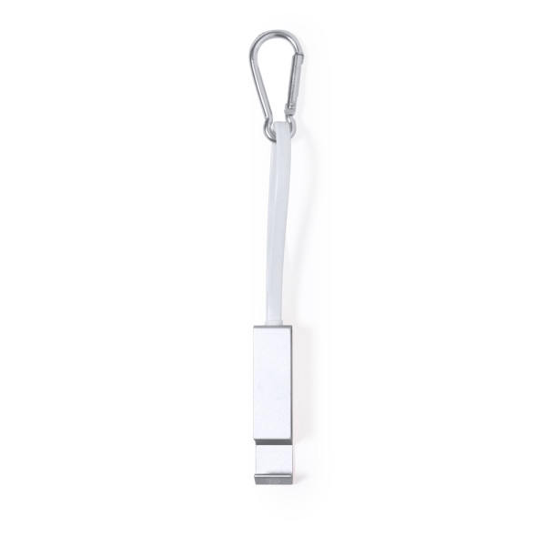 Multi-function charging cable, made of recycled aluminium and with an intelligent design for convenient storage of the charging cables, as well as easy transport. Including matching carabiner and smartphone holder, with Type C connection (input and output) and dual Micro USB / Lightning connection. Available in a variety of metallic finish colours and with Recycled Aluminium logo. Presented in an individual recycled bag.Recycled Aluminium is a material with almost infinite recycling possibilities, keeping its original properties and consuming less energy during this process.GRS Certification (Global Recycled Standard), which guarantees the recycled origin of the material used to manufacture the product.