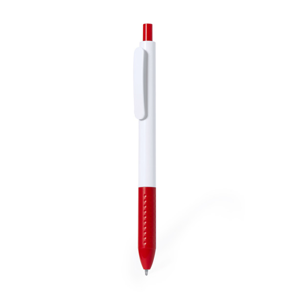 Push-button mechanism ball pen in resistant ABS. Made in an elegant combination of barrel and clip in white tones. Push button and grip available in a variety of vibrant colours. In blue ink.