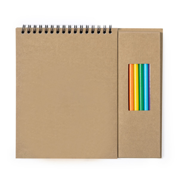 Great pencils and notebook set made of Recycled cardboard. Window box with 8 pencils and hexagonal shape in different colours. Including a ring notebook with 6 sheets of natural motifs and 18 blank pages.
