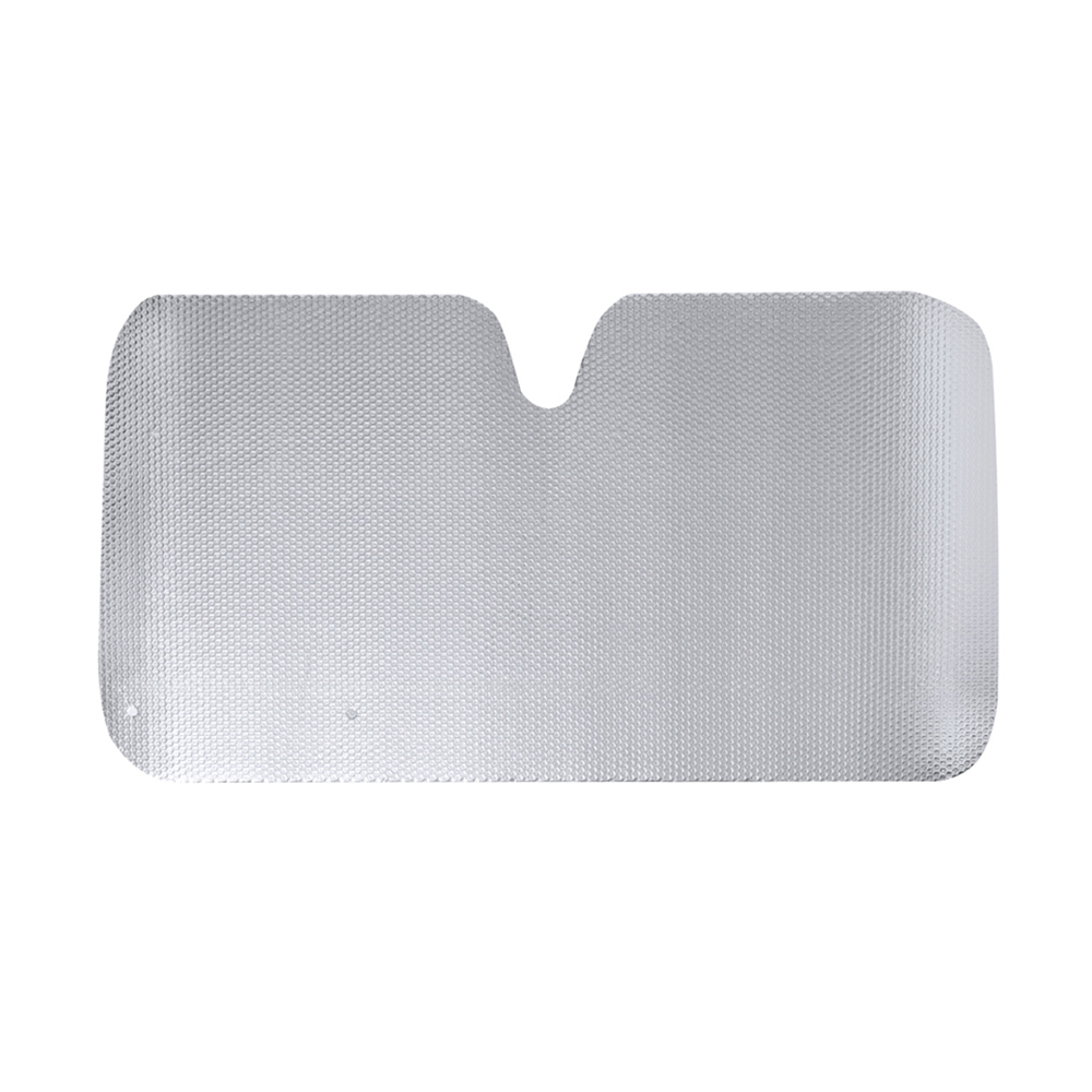 Aluminium sunshade with bubble on both sides and size 130x70 cm. Metallic silver finish, with original design without piping. Easily and quickly foldable, with button closure. Presented unfolded flat for an optimal printing, with separated bags.