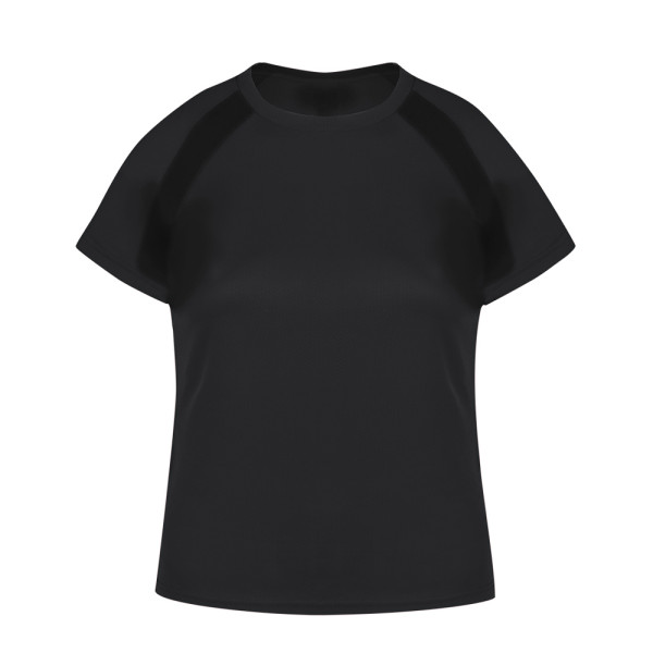 Woman technical T-shirt in 100% polyester breathable 135g/m2 material. With raglan sleeves, round neck and with front and side bands in breathable micro-perforated fabric. Available in sizes S, M, L, XL.