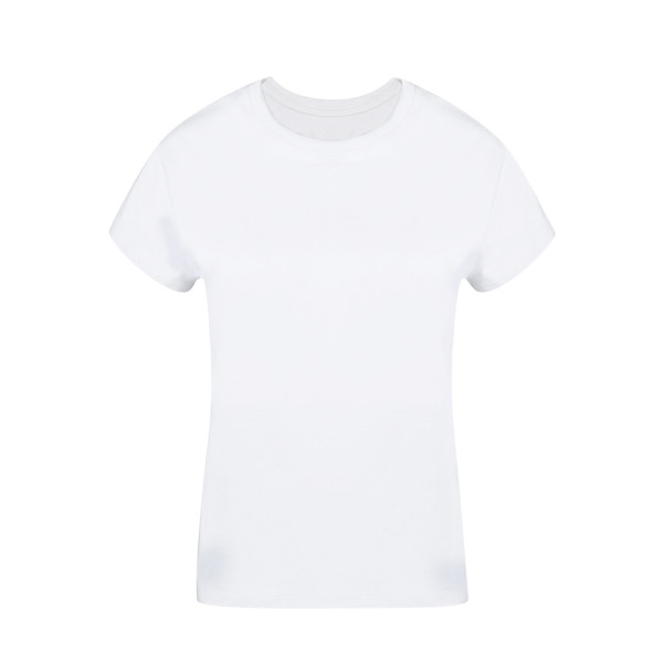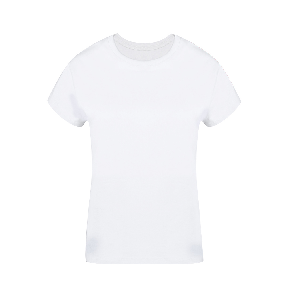 Women's T-shirt made from smooth knit fabric with soft 100% cotton, 160g/m². Tubular design without side seams and round neck. Available in white and in sizes S, M, L, XL, XXL.