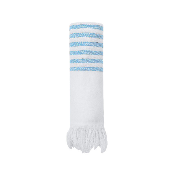 Soft pareo-towel of 300 g/m², made from a combination of recycled cotton and recycled polyester SEAQUAL. Its design features a white base combined with colored stripes and distinguished fringes at the ends. Includes SEAQUAL design label, certifying its sustainable origin and contribution to ocean cleaning. The SEAQUAL INITIATIVE works with collaborators and authorities to help clean our oceans. Marine waste from our beaches, ocean floors, and surfaces, rivers, and estuaries is collected through cleaning programs. It is then sorted into different types of materials, and the plastic portion is cleaned and transformed into RECYCLED MARINE PLASTIC, a fully traceable raw material that creates sustainable and inspiring products. By choosing products that contain RECYCLED MARINE PLASTIC, you are helping to clean our oceans. TOGETHER FOR A CLEAN OCEAN.