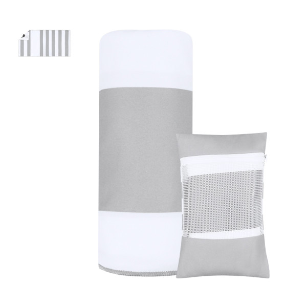 Towel with waterproof pocket and case. Made from soft 200g/m2 polyester, it includes a practical triangular waterproof pocket in the corner, with zipper closure ideal for protecting your personal belongings. Its striped design is complemented with a mesh case and zipper closure.