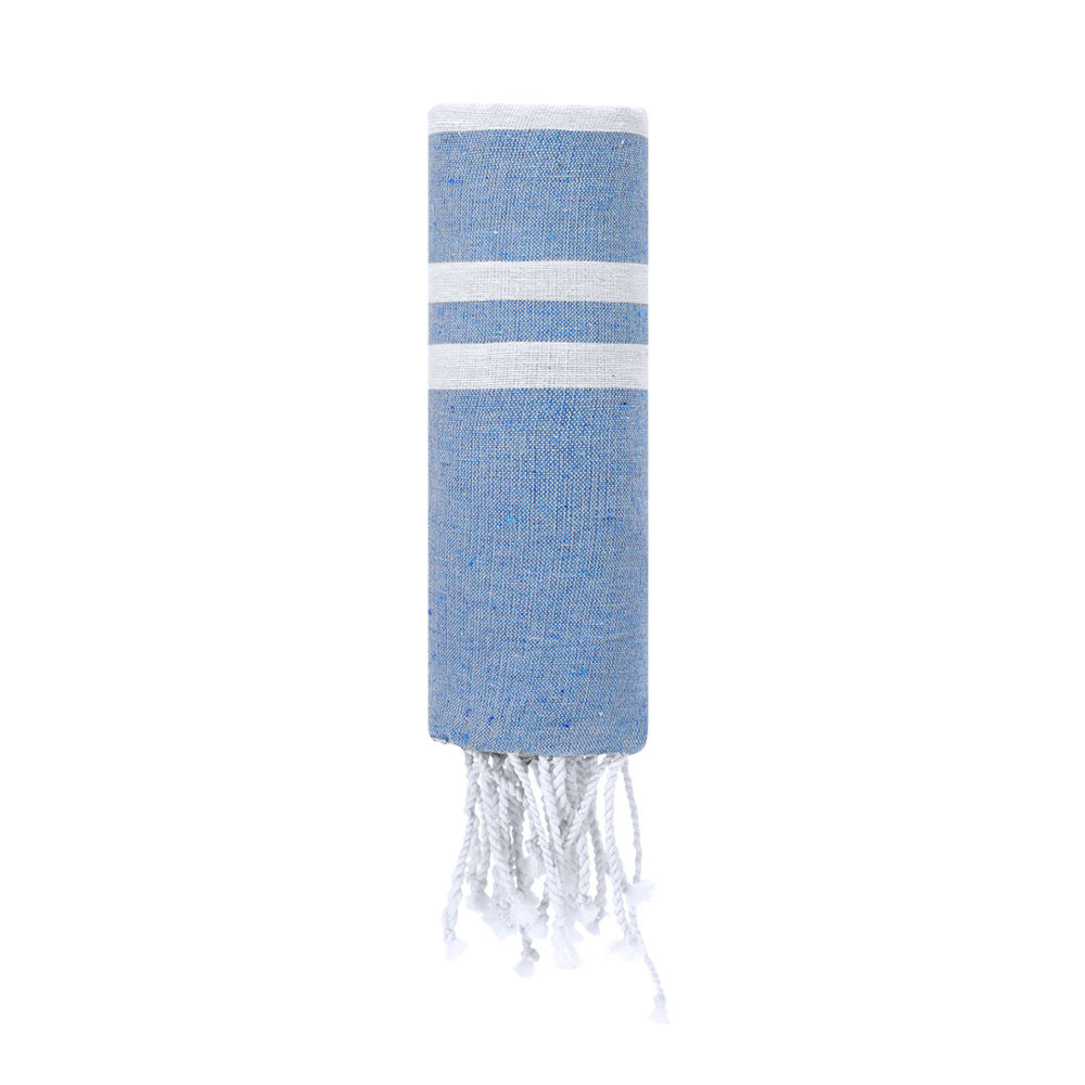 Soft pareo-towel of 150g/m2 in a combination of cotton and polyester. Its design features a colored base and white stripes. Includes fringes at the ends that add decorative detail and complete its finish.
