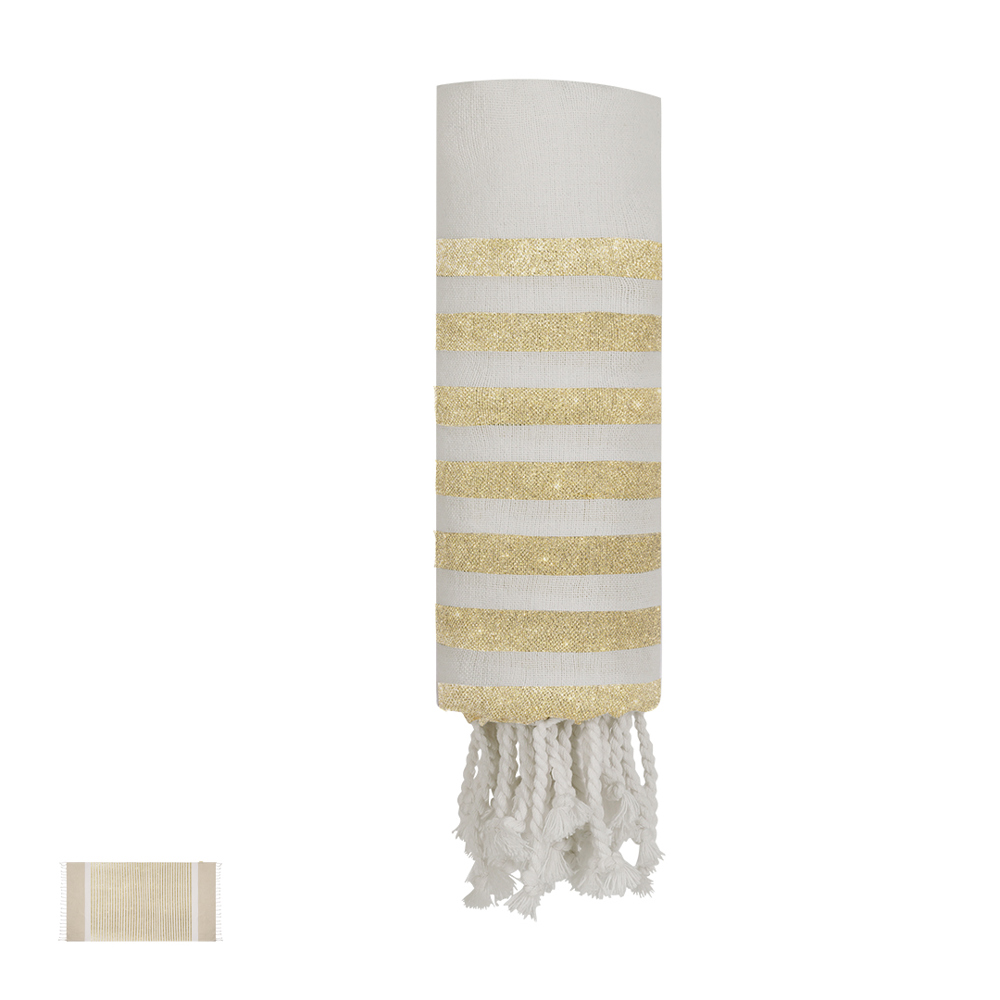 Towel Pareo made of recycled cotton of 180g/m2. White striped design combined with golden glitter stripes, solid beige ends, and distinguished cord fringes at the edges. Includes label with recycled cotton mark.