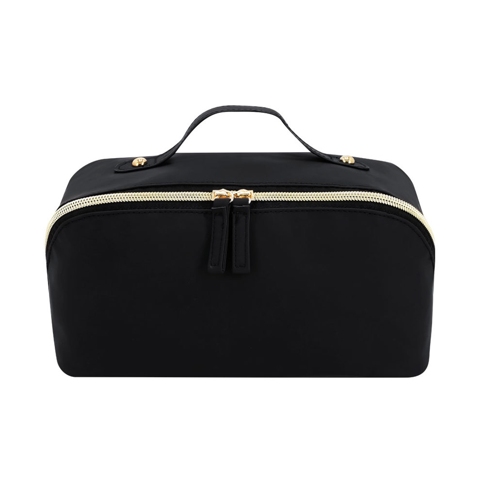 Soft PU toiletry bag, with a wide opening main compartment. With matching PU zipper pulls and golden zipper. Interior with double compartment and additional zippered pocket.