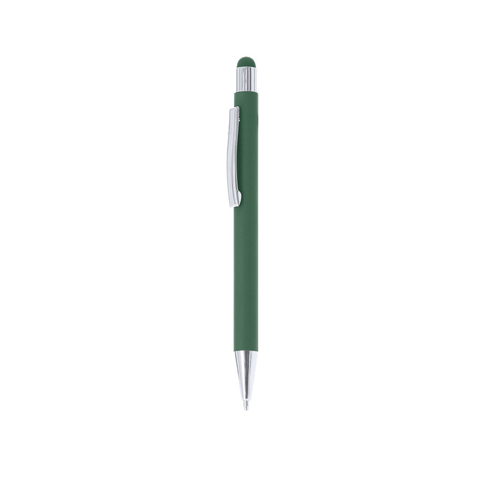 Pointer push mechanism pen made of recycled aluminum. Chrome finished push button and metal clip, finished with matching pointer. Rubber finish body, specially designed for laser marking. Recycled aluminum label on the top of the pen. Jumbo cartridge and blue ink.Recycled aluminum is a material with nearly infinite recycling possibilities, without losing its original properties and consuming less energy in this process.GRS certification (Global Recycled Standard) guarantees the recycled origin of the material used to manufacture the product.