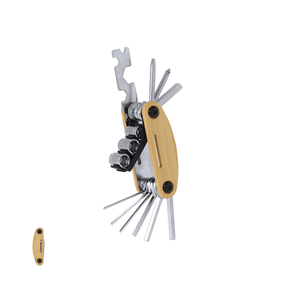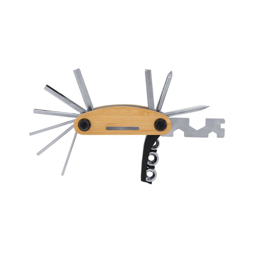 Multitool made of durable stainless steel with bamboo casing. With 15 functions:- Allen keys- Hexagonal keys- Flat screwdriver- Star screwdriver- Phillips screwdriver- Tube adapter for hex nuts- Socket wrenchesMaterials like bamboo promote the use of natural raw materials, reducing pollutant emissions. It comes from a resilient and versatile plant, with fast growth and regeneration, making it an excellent alternative to traditional wood.