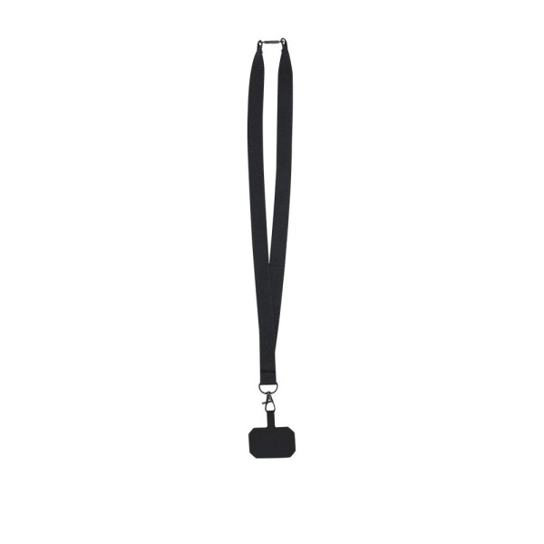 Original lanyard support in soft polyester, adaptable by the transport accessory to sit between the case and the smartphone. Matching transport strap, rotating metal carabiner in black and has a security accessory at the neck.