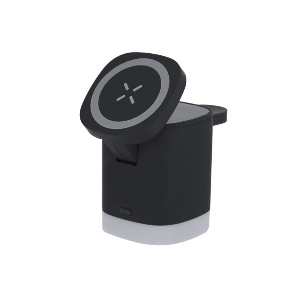 Magnetic 3-in-1 wireless charger with 15W, made from recycled ABS (RABS). Designed for the simultaneous charging of a smartphone, headphones, and smartwatch.It has a built-in lamp in the base with 2 adjustable light modes in white.Type C cable included. An all-in-one gadget: foldable, portable, versatile, and with functional design.The RABS is a highly recyclable plastic that offers great resistance and a multitude of applications that make it an eco-friendly solution.Manufactured according to RoHS standards and complies with the following safety requirements:Overheating protection system.Overload protection system.Locking system to prevent short circuits.
