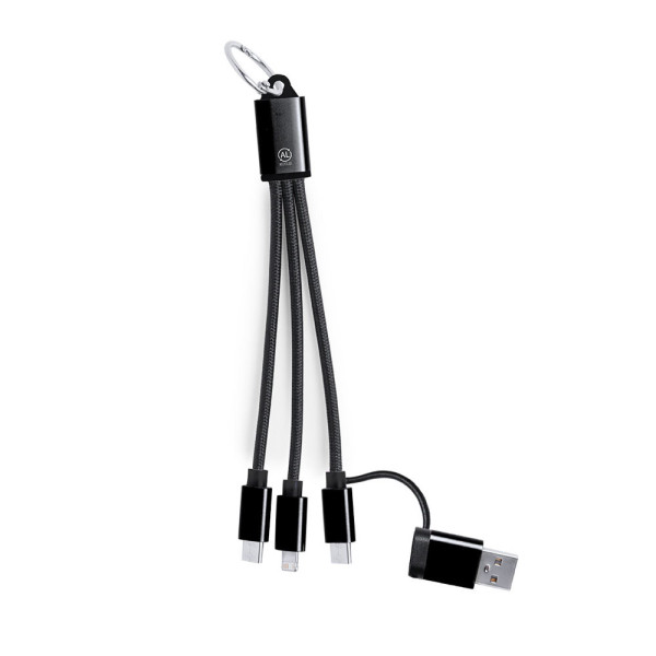 Charging cable made from Recycled Aluminum. With dual input Type C/USB and Type C, Lightning, and Micro USB outputs. Includes a Recycled Aluminum label.Recycled Aluminum is a material with almost infinite recycling possibilities, without losing its original properties and consuming less energy in the process.GRS (Global Recycled Standard) certification, which guarantees the recycled origin of the material used to manufacture the product.Micro USB, Type C, and Lightning connection 5V DC 2.4A.