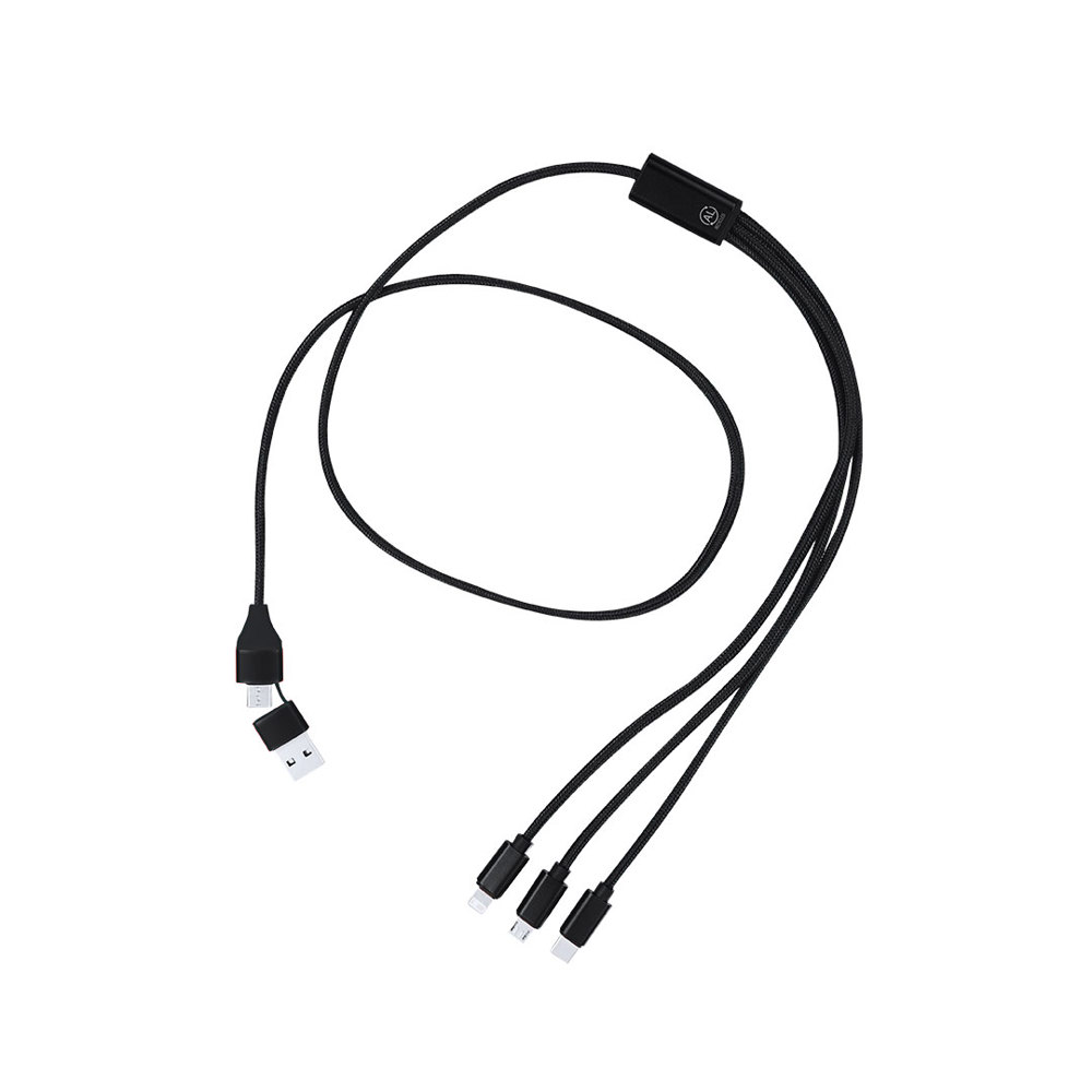 Charging cable made from Recycled Aluminum. With dual input Type C/USB and Type C, Lightning, and Micro USB outputs. Includes a Recycled Aluminum label.Recycled Aluminum is a material with almost infinite recycling possibilities, without losing its original properties and consuming less energy in the process.GRS (Global Recycled Standard) certification, which guarantees the recycled origin of the material used to manufacture the product.Micro USB, Type C, and Lightning connection 5V DC 2.4A.