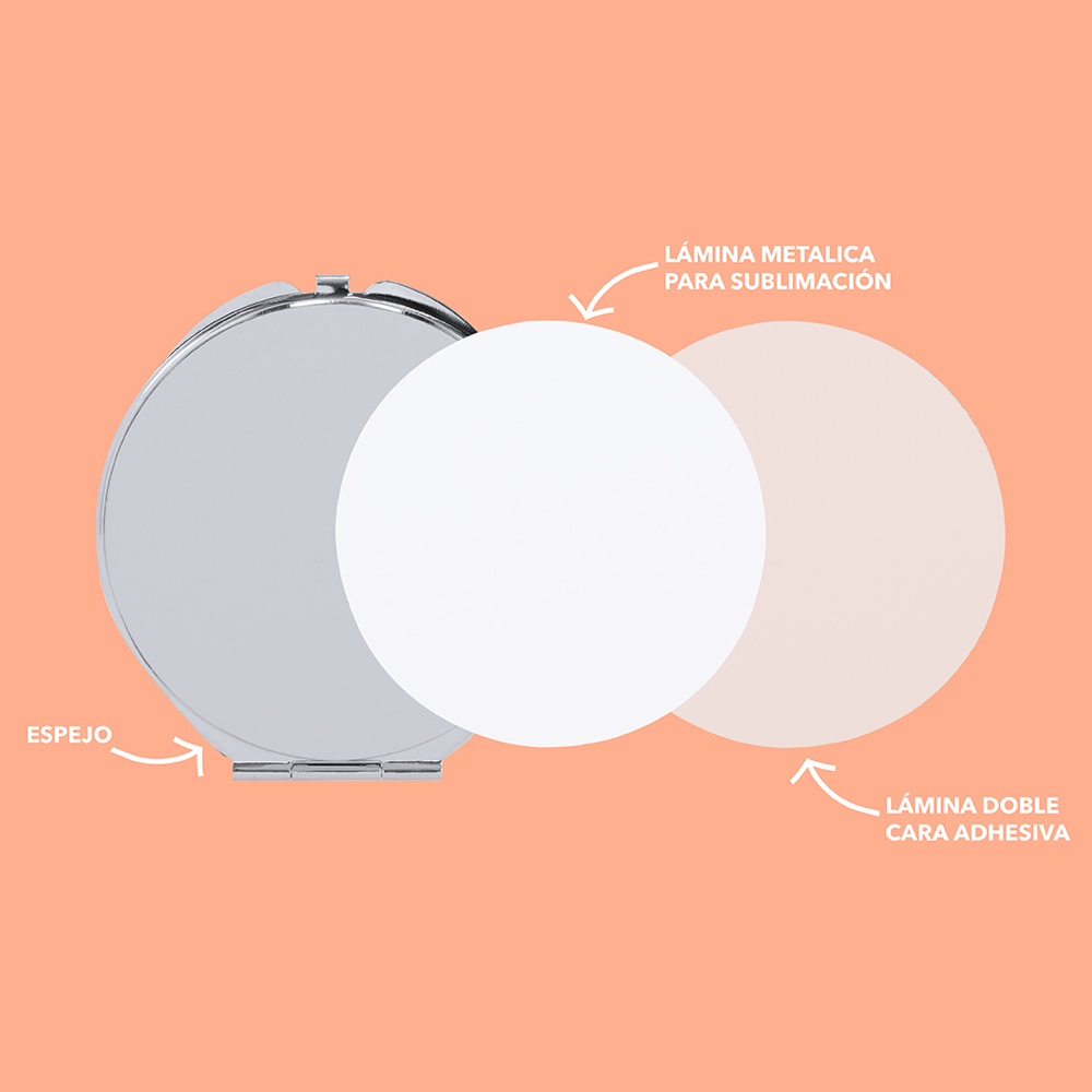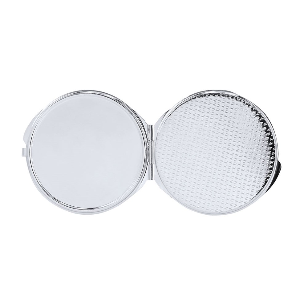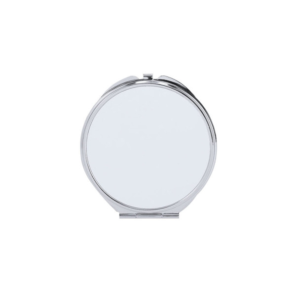 Folding metal mirror with an area for sublimation (not integrated into the product, ideal for printing and applying later). With two interior mirrors: 1X and 2X magnification.