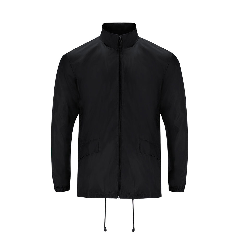 Unisex high-neck rain jacket with detachable hood. The hood features adjustable drawstrings for a... more