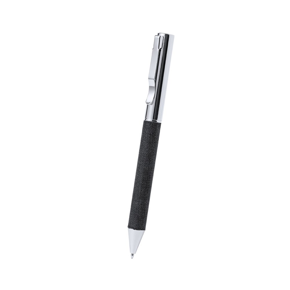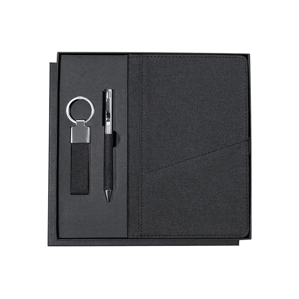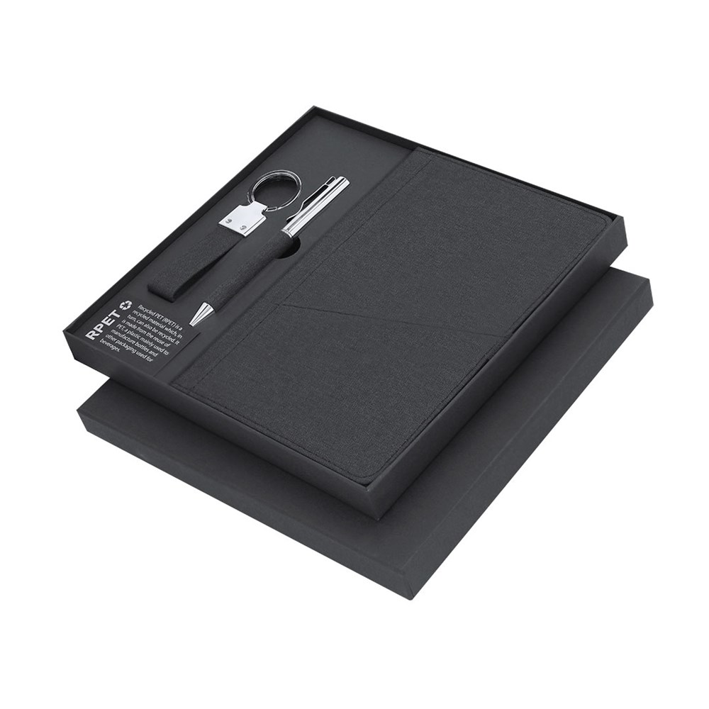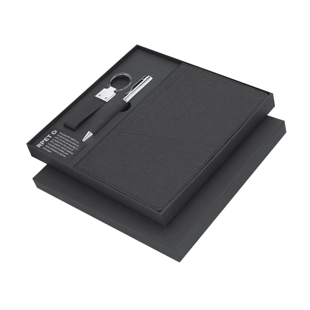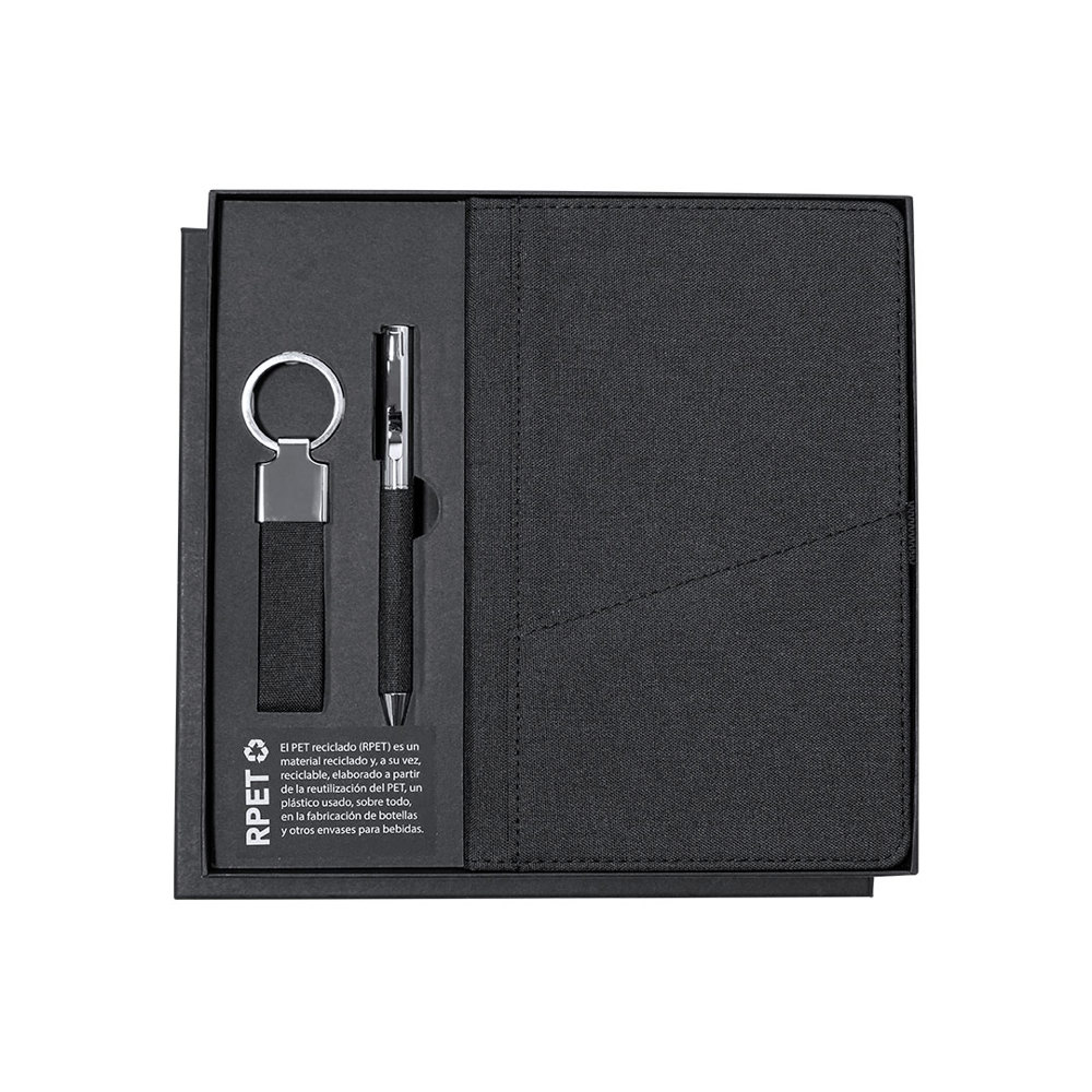 Elegant premium set that includes:Notepad in RPET in elegant black color. Includes elastic closure, front pocket, and fabric bookmark. Interior with 80 lined cream-colored sheets.Pen in RPET with matte black finish, rotating mechanism, and blue ink. With clip and polished metal tip.Elegant keychain with strap made from RPET 300D polyester and chrome accessories.Set presented in individual matte finish case, with die-cut interior for each element of the set and RPET card inside.RPET material is made from recycled plastic, promoting the reuse of plastic waste and helping to sustain the planet.