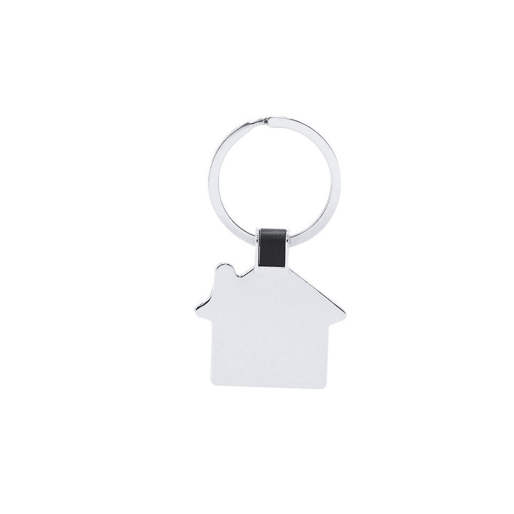 Metal keychain with house design and black detail.