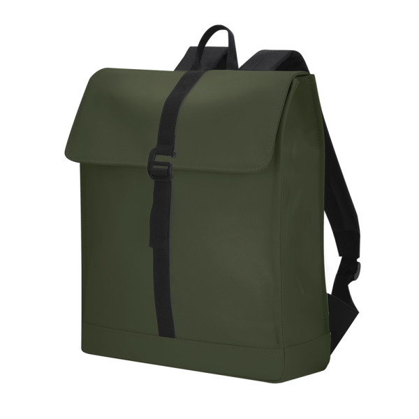 Backpack made of soft PU. With a main pocket and buckle closure system. Large capacity interior with padded compartment for laptops up to 14 inches or tablets up to 10 inches. Padded back and straps. Includes strap for trolley.