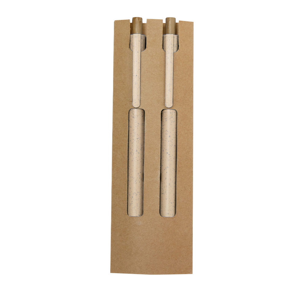Set of pen and eternal pencil made from wheat straw and bamboo. Pen with push mechanism made from bamboo with blue ink and matching clip. And pencil with push mechanism made from bamboo featuring an eternal tip, allowing the use of the same pencil without generating waste. Presented in a recycled cardboard case. With printed wheat straw label.Made from plant-based materials to promote the use of natural raw materials and reduce contaminating emissions.