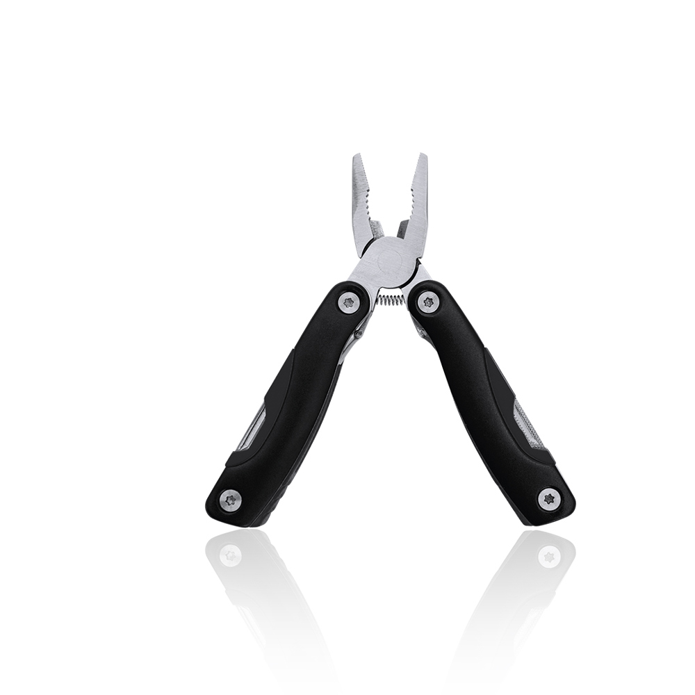 Multi-tool with heavy-duty stainless steel body and 12 functions. Including flat knife, serrated knife, screwdrivers, file, opener, and pliers. Available in a wide range of colours and presented in a resistant polyester sleeve and in an individual box.