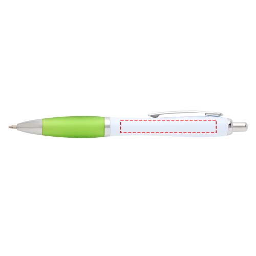 The Nash ballpoint with a stylish curvy design and a soft grip is made of recycled plastic that is hard and solid and thus offers a long life span. Ink colour: Blue. Writing length: 1000 metres. Nib size: 1.00 mm.