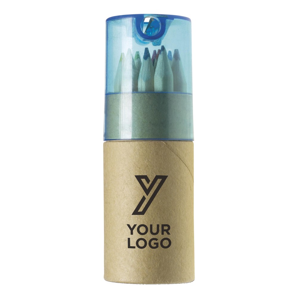Cardboard and ABS tube with 12 colored pencils and sharpener integrated in the lid.
