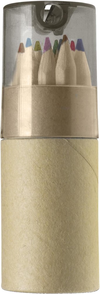 Cardboard and ABS tube with 12 colored pencils and sharpener integrated in the lid.